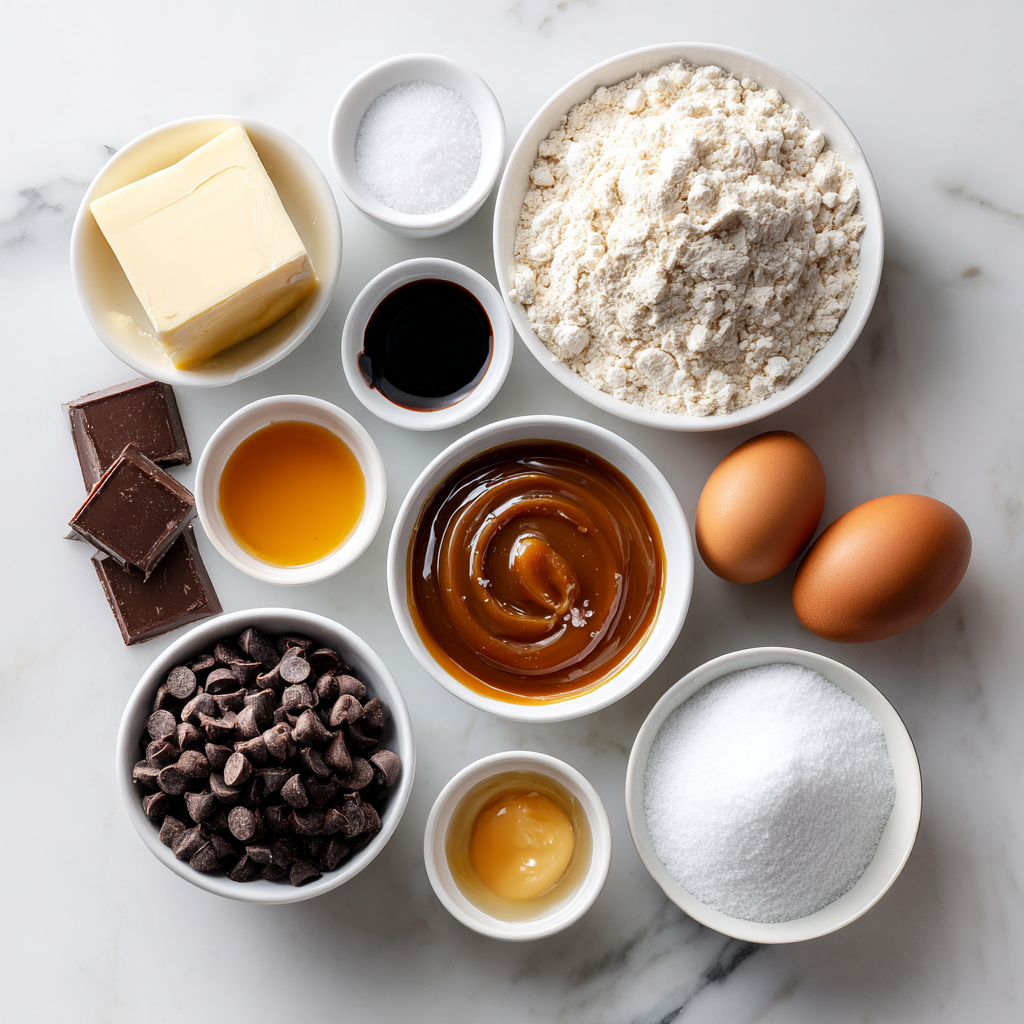 Each ingredient plays a defined role. Brown sugar adds moisture and chewiness, granulated sugar assists with structure, butter carries flavor, and eggs bind everything together. Caramel introduces a soft, flowing layer, while flaky salt sharpens sweetness and prevents the bars from tasting one-dimensional.