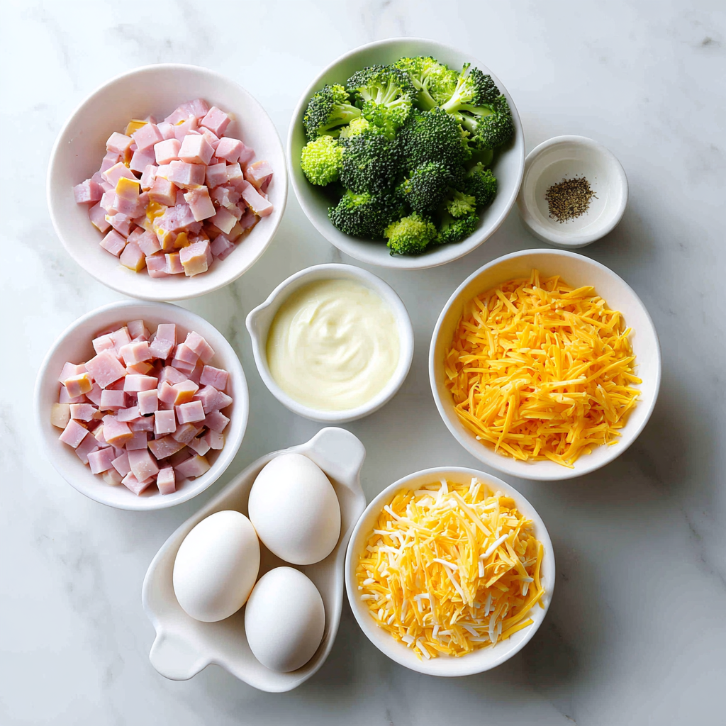 Dice ham, chop broccoli, shred cheese if needed. - Whisk the Eggs