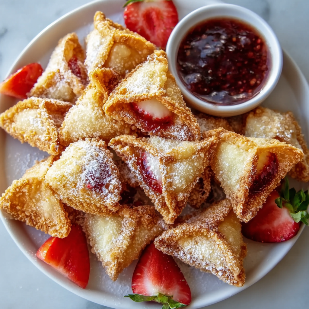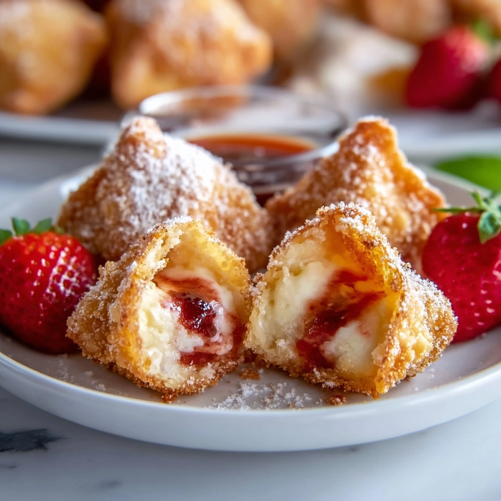 These bite-sized delights are dangerously addictive. Each wonton turns into a crisp, delicate pocket that gives way to smooth cheesecake filling, lightly sweetened and studded with juicy strawberries. They’re perfect for parties, holidays, family gatherings, or simply when you want a dessert that feels fun, unique, and irresistibly decadent.