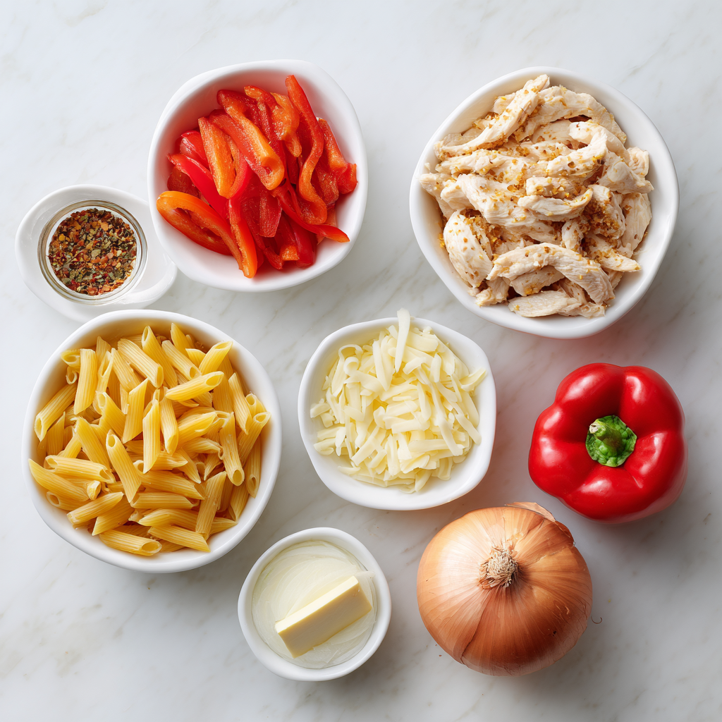 To make this creamy chicken fajita pasta, you’ll need the following fresh and simple ingredients. This list serves 4 people and focuses on quality staples for maximum flavor.