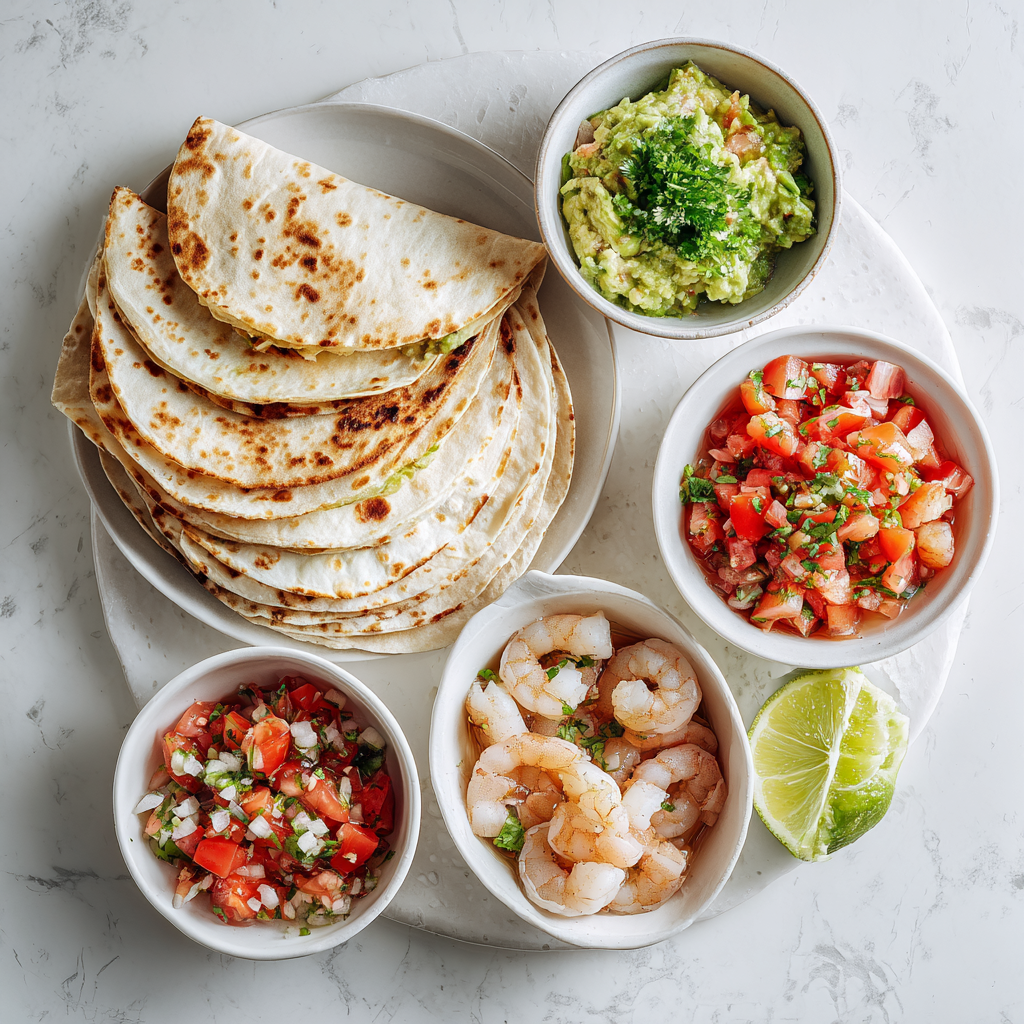 - Assemble the quesadillas: Place a tortilla on a clean surface. Sprinkle 1/4 cup cheese on one half, add a portion of the shrimp mixture, top with another 1/4 cup cheese, then fold the tortilla over. Repeat for remaining tortillas.