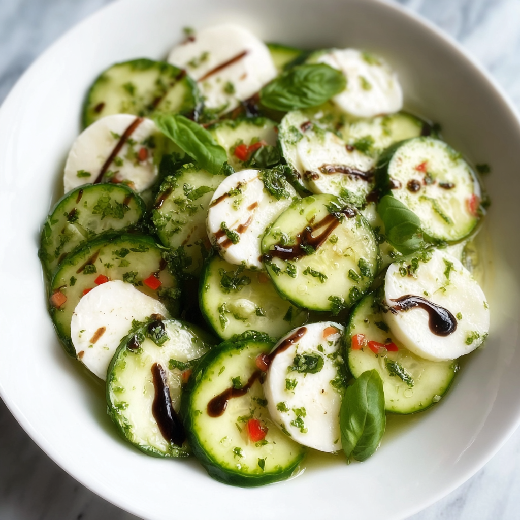 A fresh, no-cook salad with crisp cucumbers, juicy tomatoes, creamy mozzarella, and basil in a simple balsamic dressing – quick and perfect for busy days.