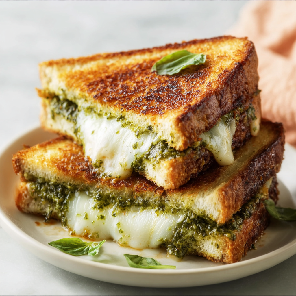 A gourmet twist on classic grilled cheese with vibrant basil pesto and melty cheeses on toasted bread.