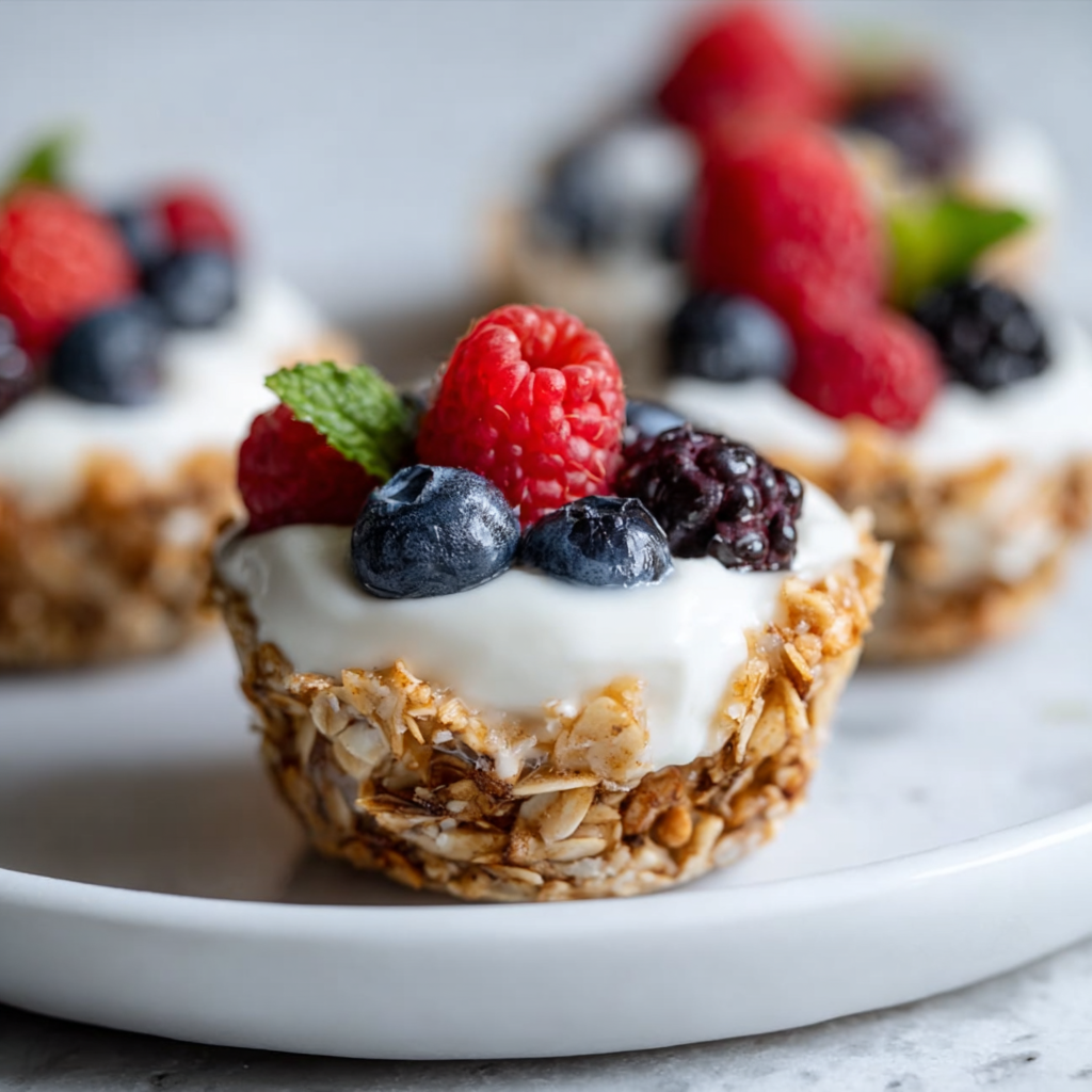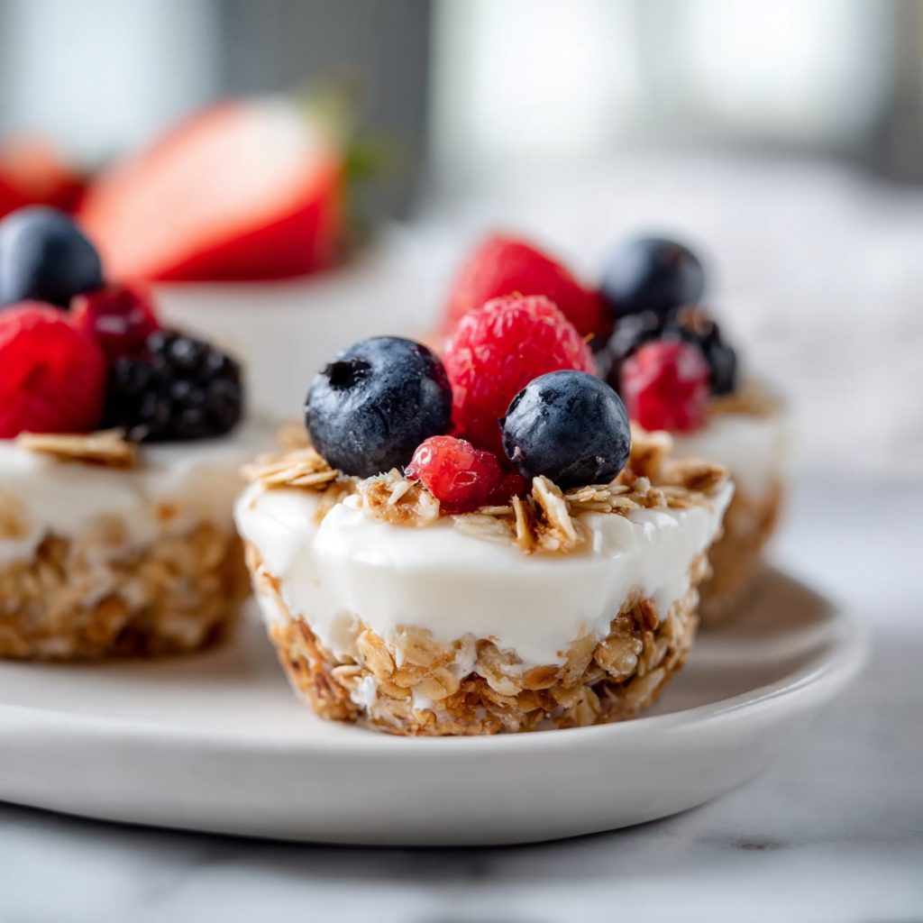 Each cup is portion-controlled, making them great for mindful eating. They’re naturally gluten-free (with GF granola), can be dairy-free (plant-based yogurt), and pack around 150-200 calories per serving with 8-12g protein—perfect as a post-workout bite or afternoon pick-me-up. Kids love the fun mini format, adults appreciate the wholesome ingredients, and everyone enjoys the contrast of crunchy base and creamy top.