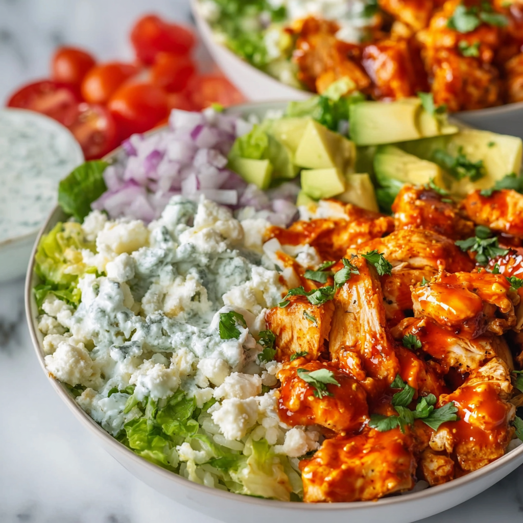 - Assemble bowls: base, buffalo chicken, then pile on fresh toppings.