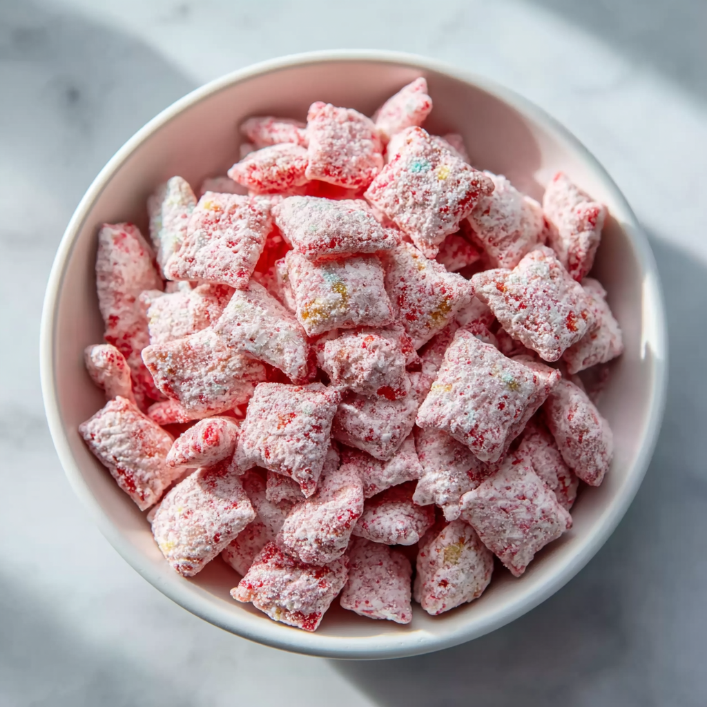 Freeze-dried strawberries are the secret weapon here. Unlike fresh berries, they pulverize easily into a fine powder that coats the cereal evenly, infusing every bite with real strawberry flavor. Combined with melted white chocolate for adhesion and powdered sugar for that signature puppy chow dust, the mix achieves the perfect balance of sweet and tart. This treat evokes the joy of strawberry shortcake—juicy berries, tender cake (here represented by the crisp cereal), and creamy elements—without any baking required.