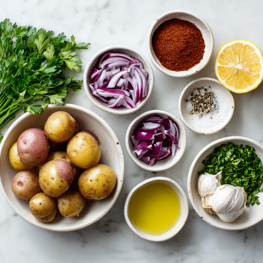 A fresh Mediterranean-style potato salad made with olive oil, lemon, herbs, and tangy sumac instead of mayonnaise.