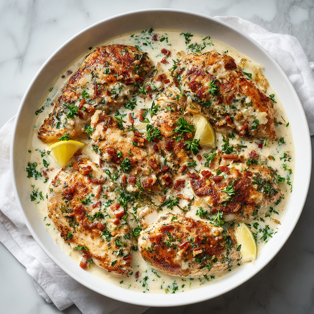 Tender chicken breasts seared then baked in a rich, velvety garlic Parmesan cream sauce with cream cheese, mozzarella, and crispy bacon for an indulgent million-dollar flavor. Ready in 45 minutes.