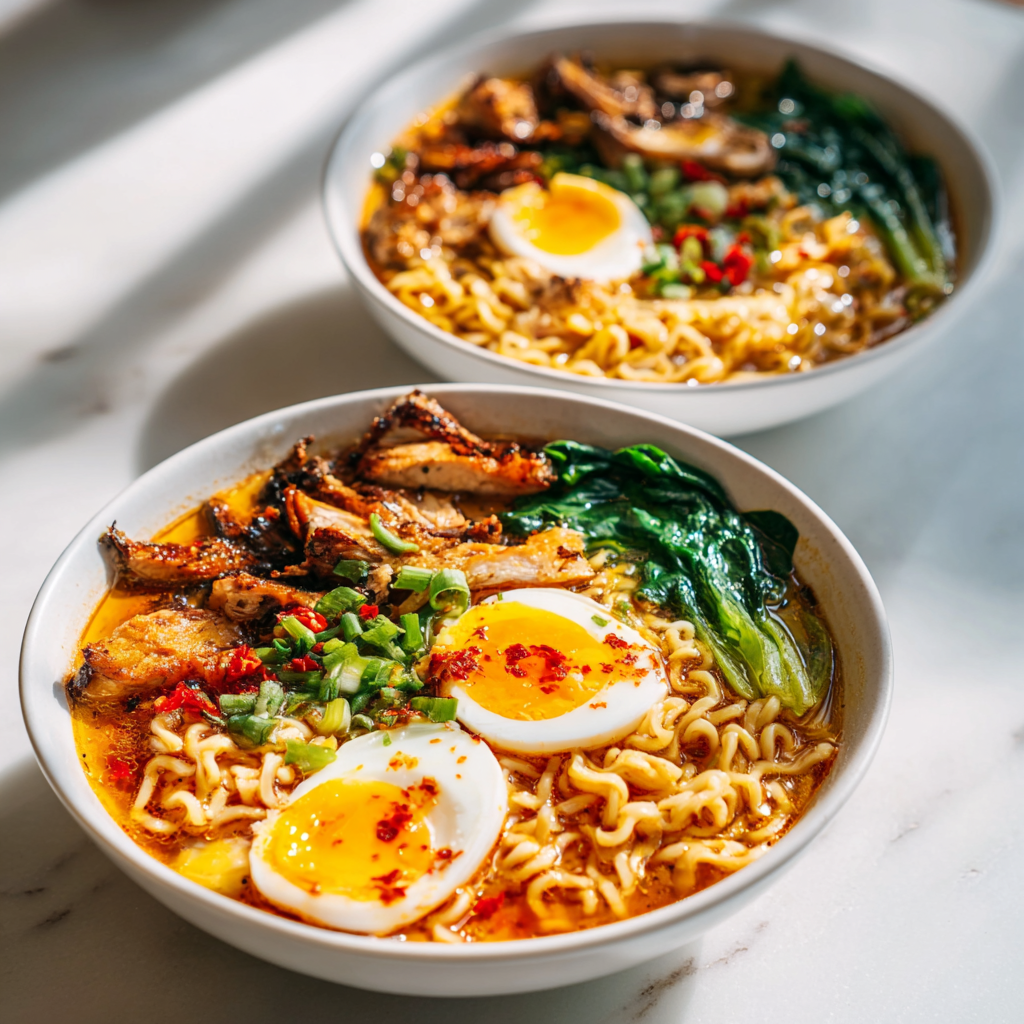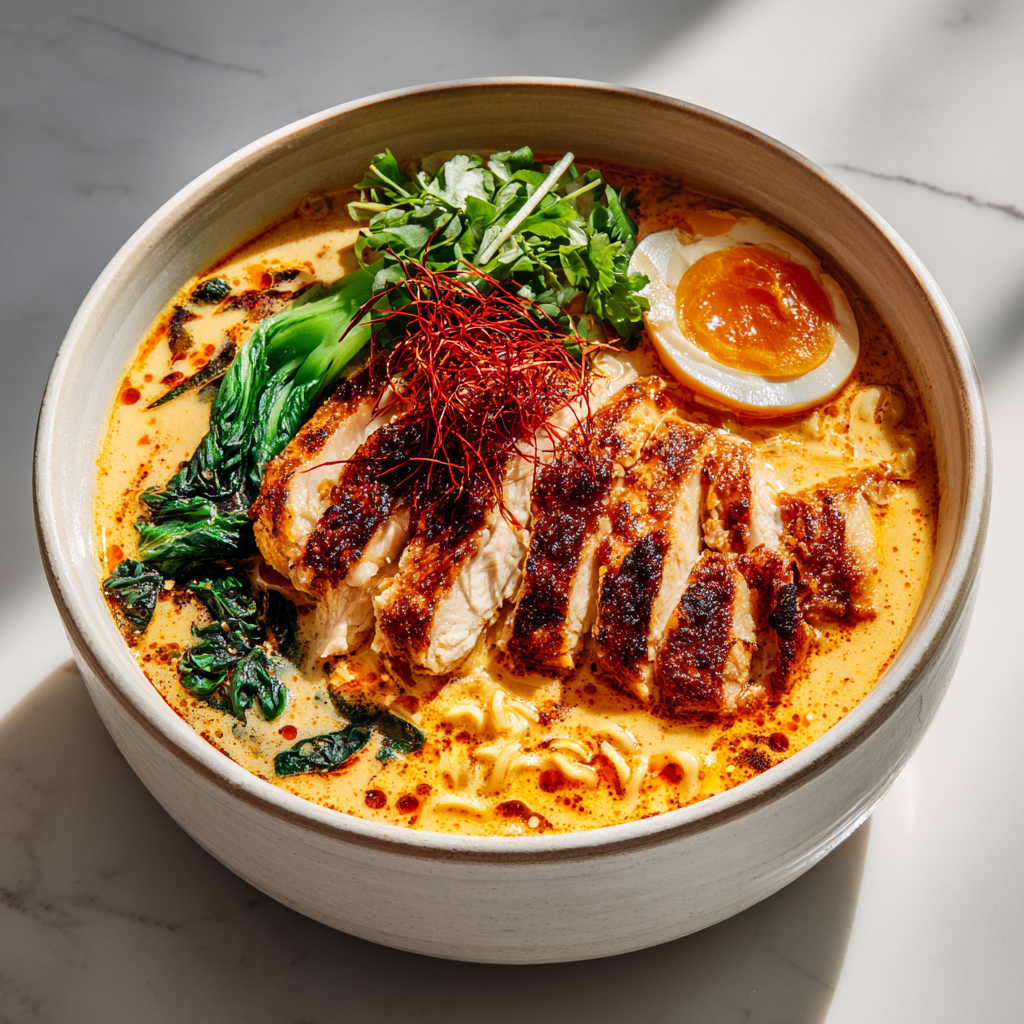 Craving ramen that packs serious heat but finishes with luxurious creaminess? Fiery Chicken Ramen with Creamy Garlic Sauce is the ultimate fusion comfort food. Tender shredded chicken simmers in a bold, chili-laced broth infused with garlic, ginger, and fiery gochujang or chili crisp, then crowned with a swirl of rich, garlicky cream sauce that tempers the spice and adds velvety depth. Topped with soft-boiled eggs, crisp scallions, sesame seeds, and chili oil, every bowl is a perfect balance of fire, umami, and indulgence. This dish bridges classic spicy ramen with creamy Western influences—think Nashville hot chicken meets tonkotsu richness—for a crave-worthy meal that’s surprisingly easy to make at home.