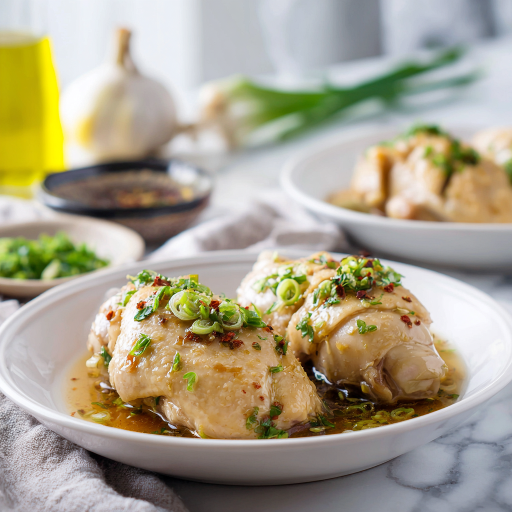 Steaming locks in juices and nutrients, producing chicken that’s far more tender than roasting or grilling. Fresh ginger acts as a natural tenderizer and flavor enhancer, while the hot oil technique (similar to Sichuan “you po” methods) blooms the aromatics without cooking them to bitterness. The result is a glossy, fragrant drizzle that clings beautifully to the chicken. This technique is versatile—use it on fish, tofu, or vegetables too. For best results, use skin-on bone-in pieces; the skin protects the meat and adds richness to the finished dish.