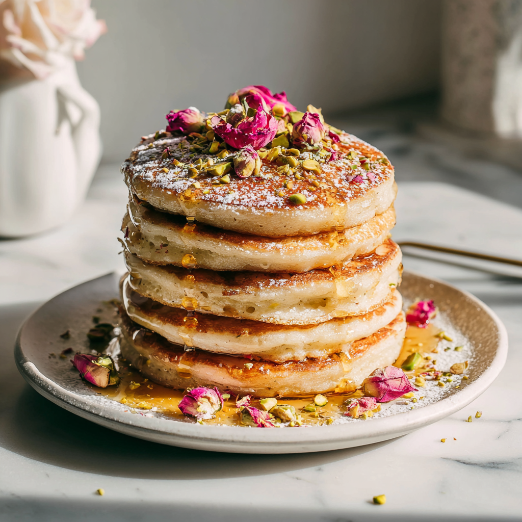 - Stack and serve warm, dusted with powdered sugar, drizzled with honey or rose syrup, and garnished with berries, pistachios, and rose petals if desired.