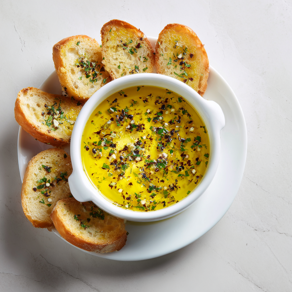 Bread dipping oil traces its roots to Mediterranean and Italian cuisine, where olive oil is a cornerstone. In Italy, simple infusions of oil with garlic and herbs accompany fresh bread as a starter. Restaurants like Carrabba’s popularized the trend in the U.S., serving warm bread with seasoned olive oil that keeps diners coming back. Today, this garlic olive oil dip is a global favorite, appearing on appetizer menus worldwide and in home entertaining.