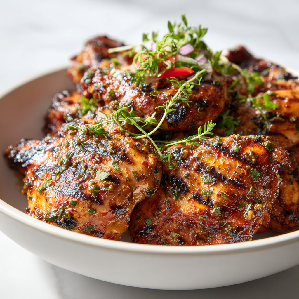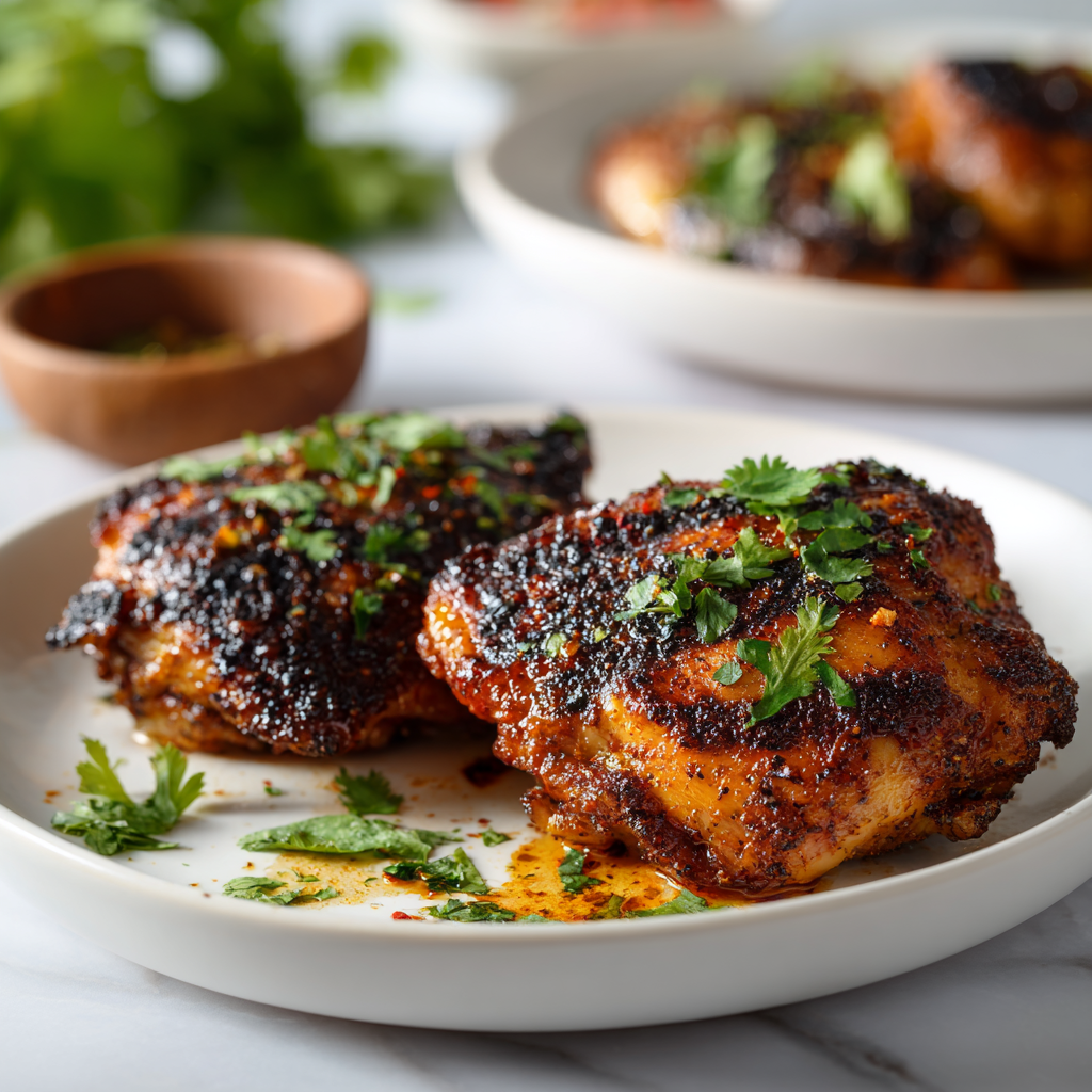 Pat chicken dry before marinating for better spice adhesion. Use a meat thermometer—thighs are forgiving but overcooking dries them out. For crispier skin on bone-in, start skin-side down. If no grill, use a cast-iron grill pan or broil. Let marinated chicken come to room temp for even cooking.