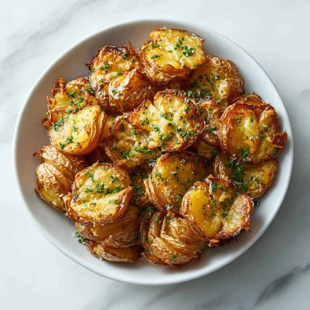 Serve these crispy smashed potatoes alongside steak, roasted chicken, or burgers for a hearty meal. Pair with aioli, garlic herb butter, or chimichurri for dipping. They’re fantastic for brunch with eggs or as part of a holiday spread. For casual gatherings, offer them family-style on a platter with dipping sauces. Leftovers make great hash browns—chop and reheat with onions.