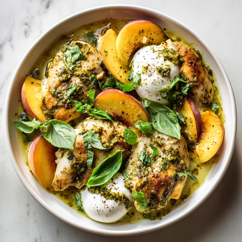 Tender pan-seared chicken is simmered gently in a delicate white wine sauce, then paired with caramelized peaches that add natural sweetness and brightness. The dish is finished with creamy burrata cheese and fragrant basil pesto, transforming it into a beautiful centerpiece that looks as stunning as it tastes.