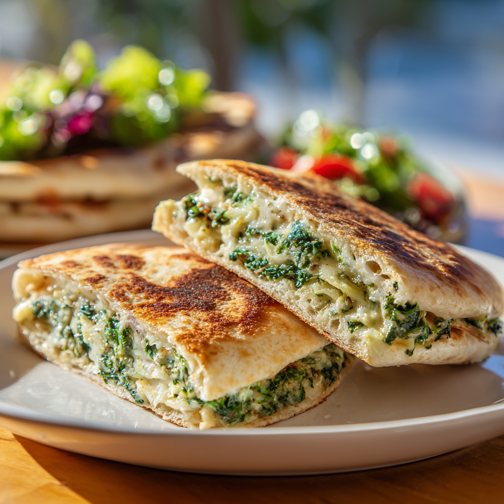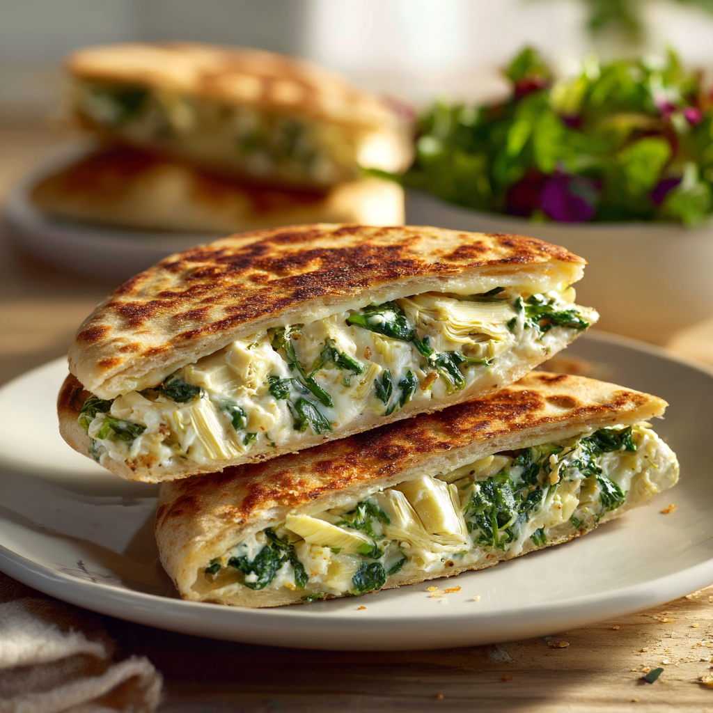 The flavors are rich, savory, and slightly tangy, thanks to the combination of cream cheese, mozzarella, and Parmesan mixed with tender spinach and marinated artichokes. Grilling the pita makes it crispy on the outside while keeping the filling melty and warm inside.