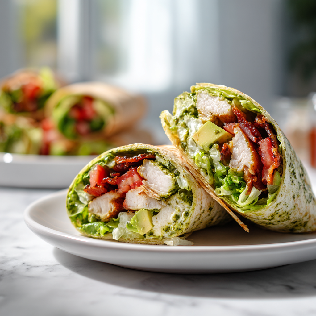 The Pesto Chicken & Avocado Bacon Salad Wrap combines classic Italian pesto flavors with American-style chicken salad and crispy bacon for a modern fusion meal.