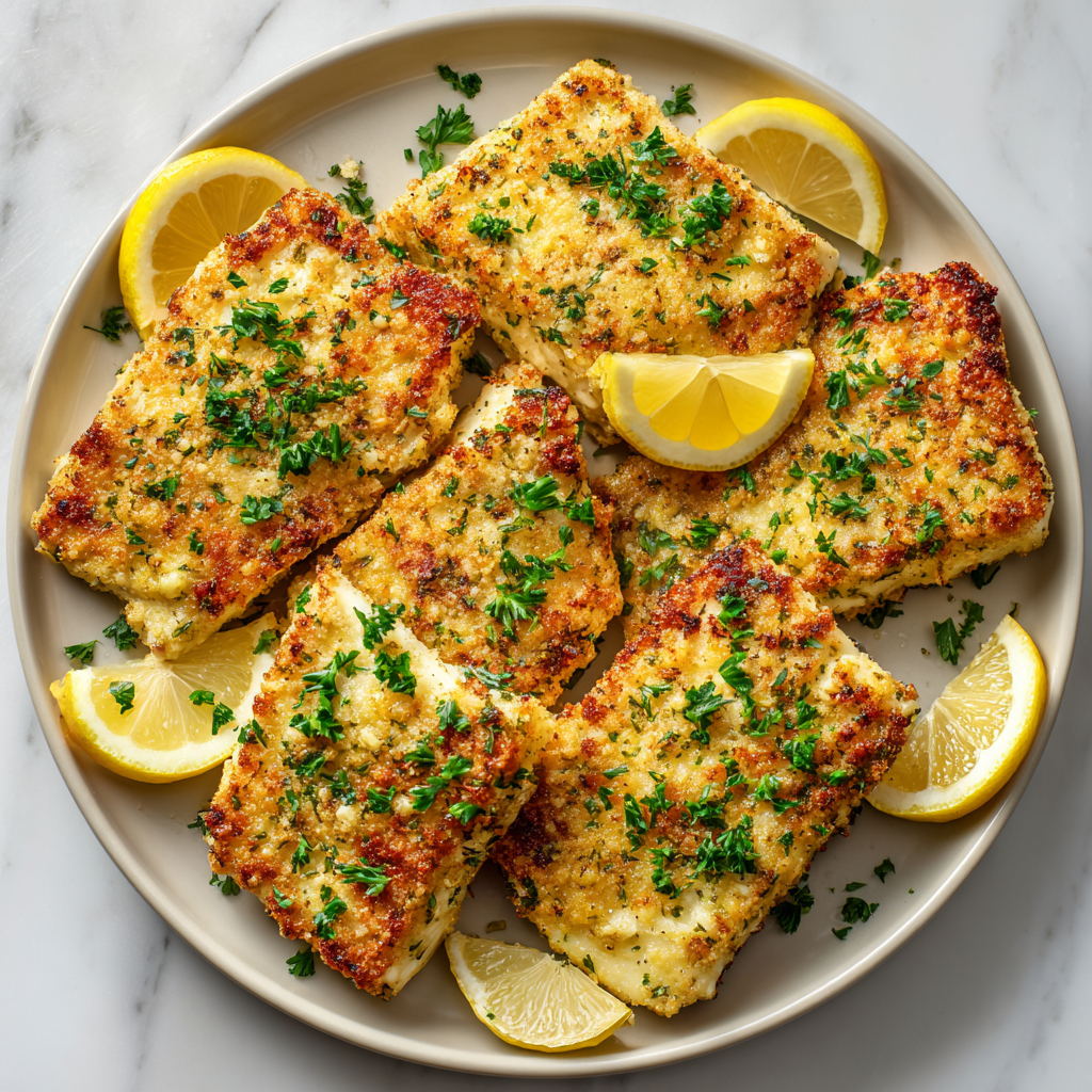 This recipe highlights the natural flavor of the fish while adding a savory, golden crust made from parmesan cheese, breadcrumbs, and aromatic garlic butter. A squeeze of fresh lemon brightens the dish and balances the richness perfectly.