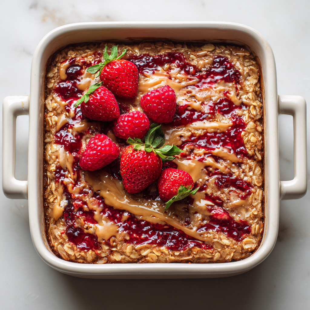 A warm and comforting baked oatmeal featuring creamy peanut butter and sweet berry jam swirled into hearty oats.
