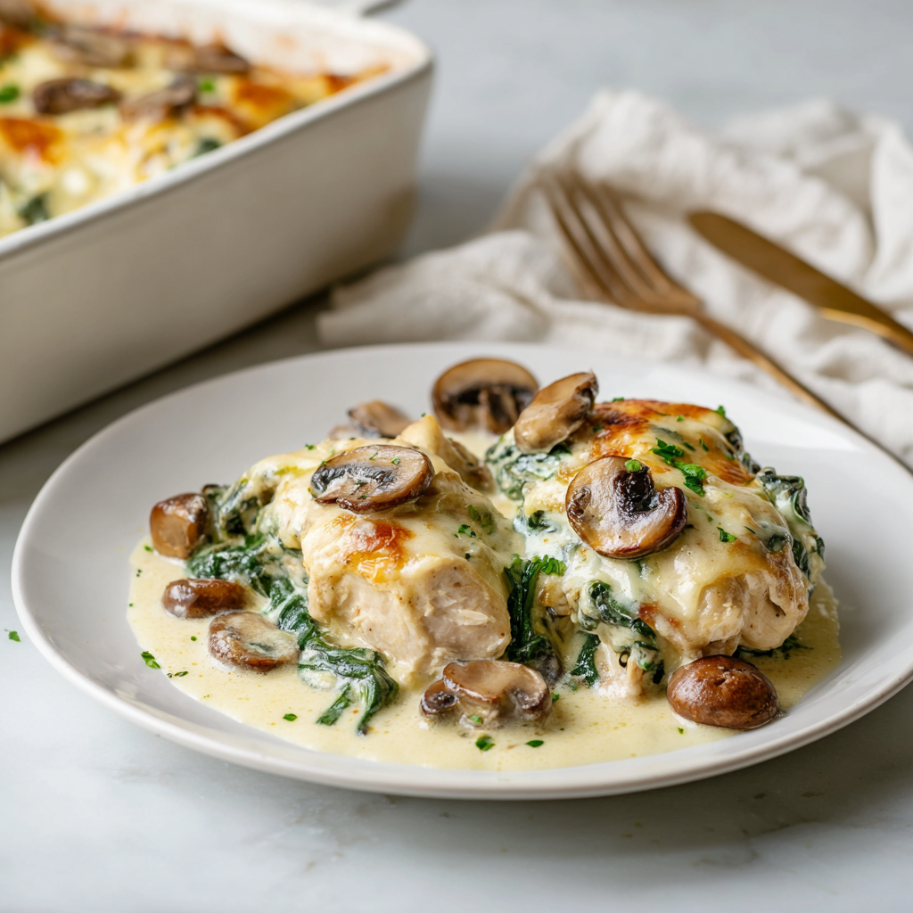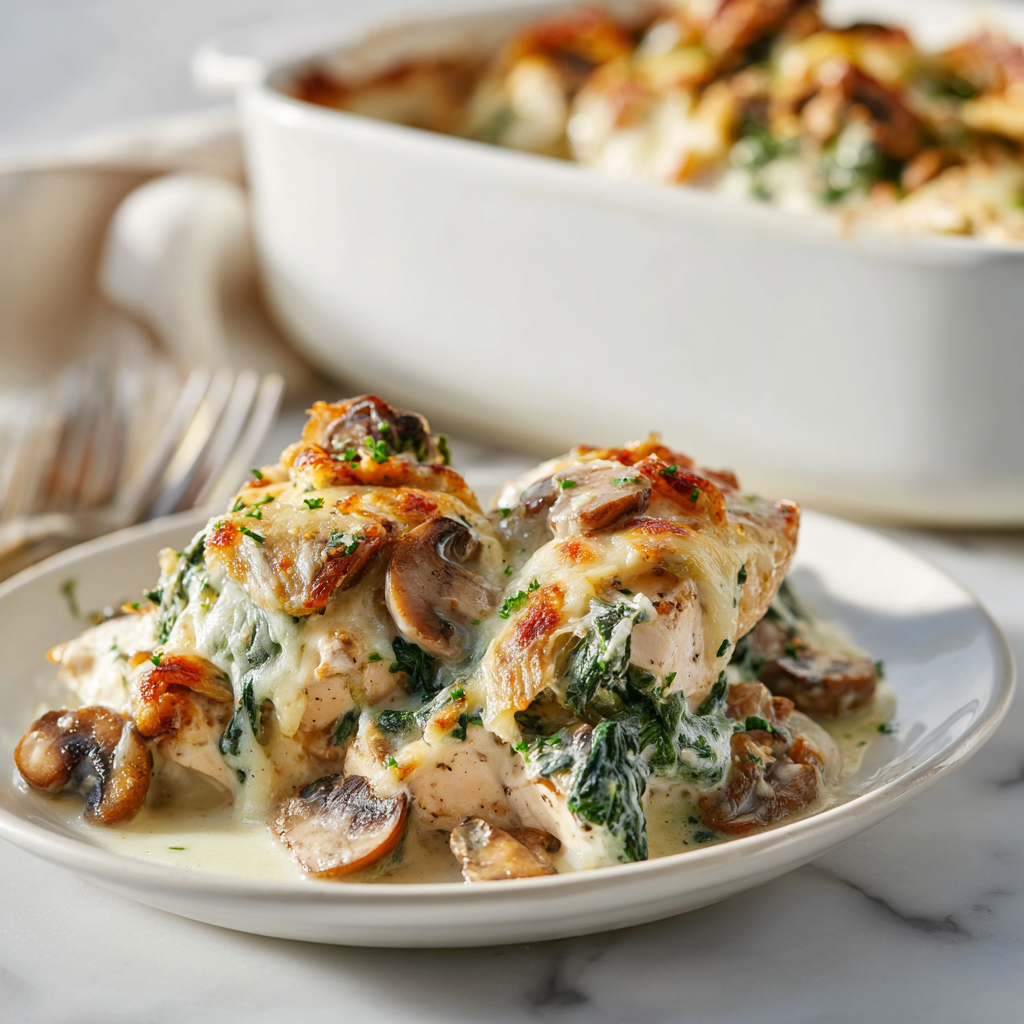 Tender baked chicken in a creamy spinach and mushroom sauce topped with melted cheese.