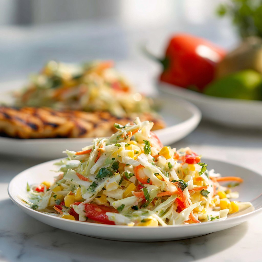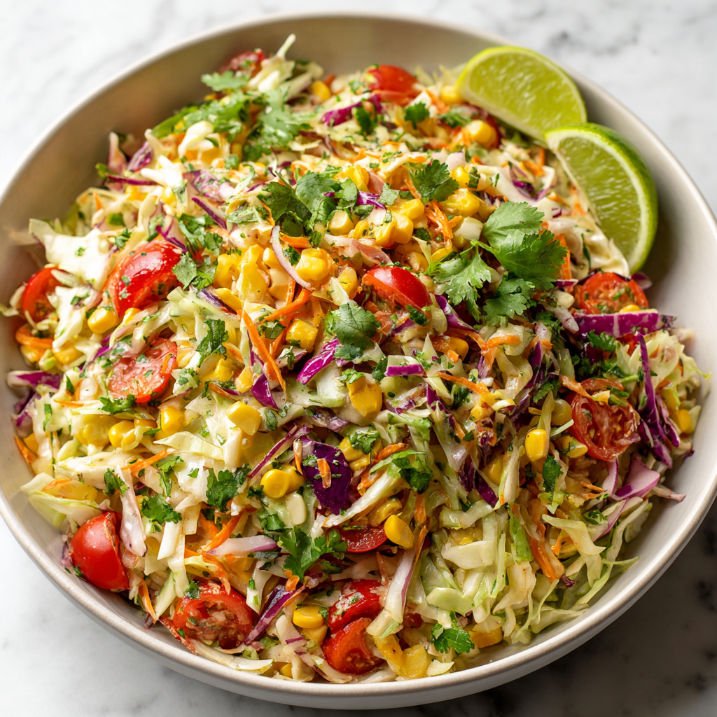 This colorful slaw combines crunchy shredded cabbage, sweet corn kernels, juicy tomatoes, crisp red onions, and fresh cilantro. Everything is tossed together in a tangy lime dressing that balances acidity, a hint of sweetness, and a touch of garlic for depth.