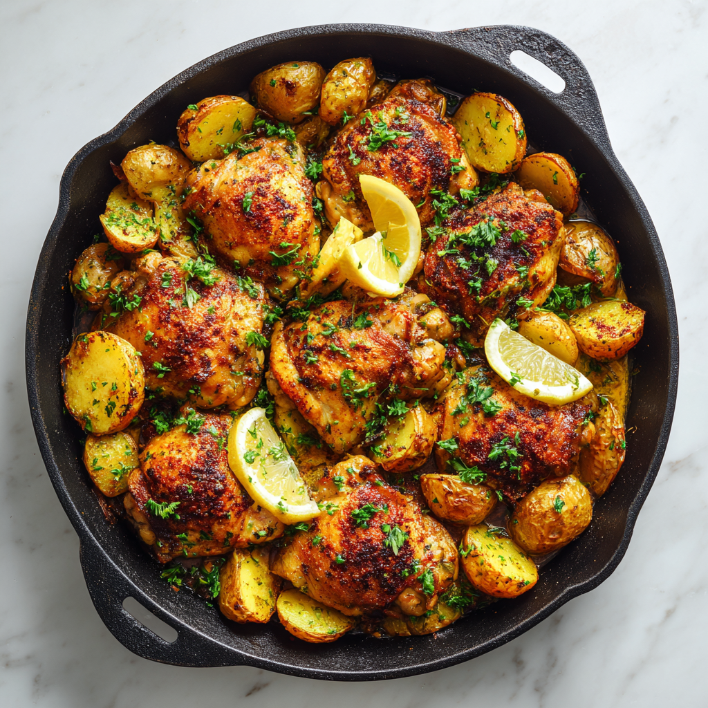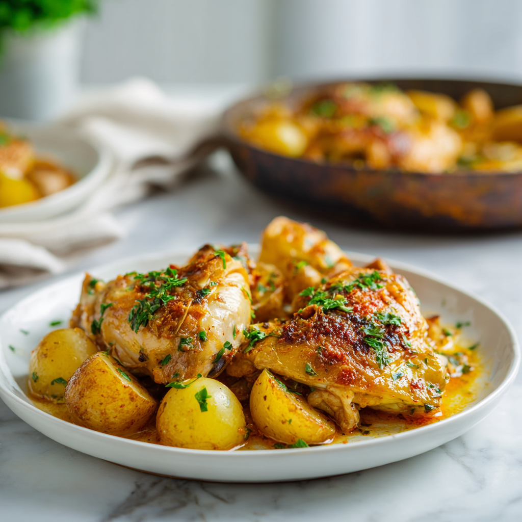 The chicken becomes beautifully golden and juicy while the potatoes absorb the savory juices and spices from the pan. The result is a hearty meal that tastes like it simmered for hours, yet it’s simple enough for a weeknight dinner.