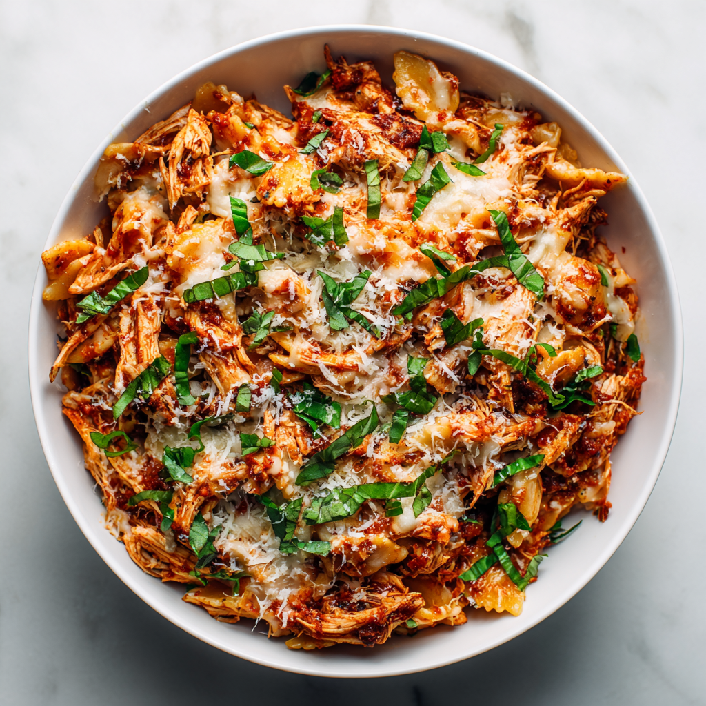 Transfer the pasta to a baking dish, add extra mozzarella, and broil for 2–3 minutes for a classic baked chicken parmesan finish.