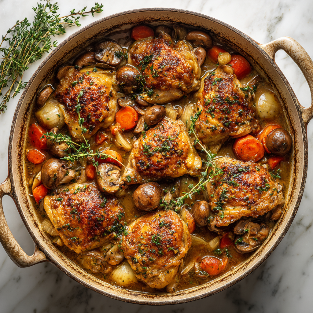 - Return chicken to the pot, add thyme and bay leaf, and simmer covered for 30–35 minutes.