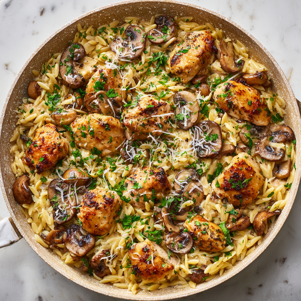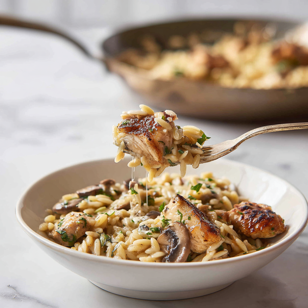 Grab your skillet, simmer everything together, and enjoy a comforting bowl of creamy chicken and mushroom orzo.