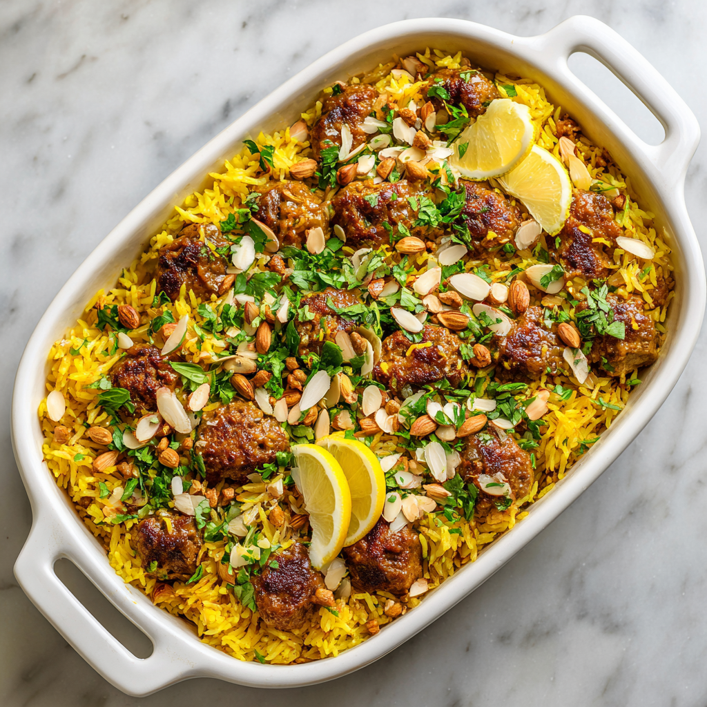 A fragrant baked rice dish layered with saffron-infused basmati rice and aromatic spiced meat, finished with toasted nuts and herbs.