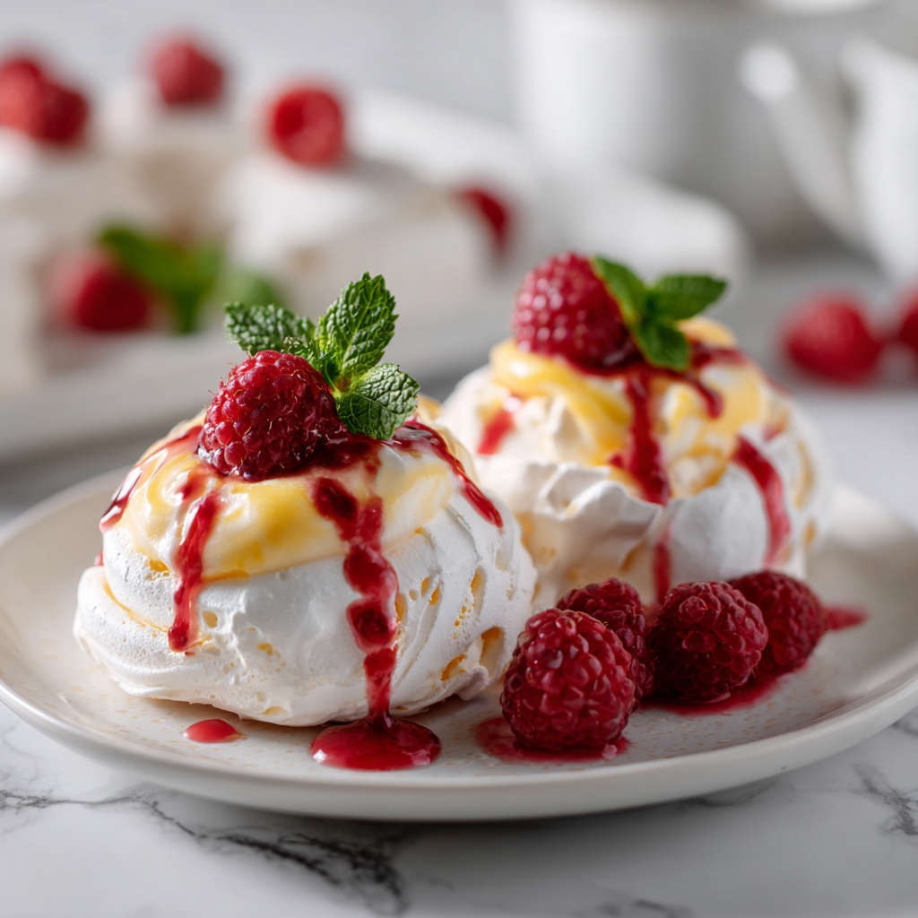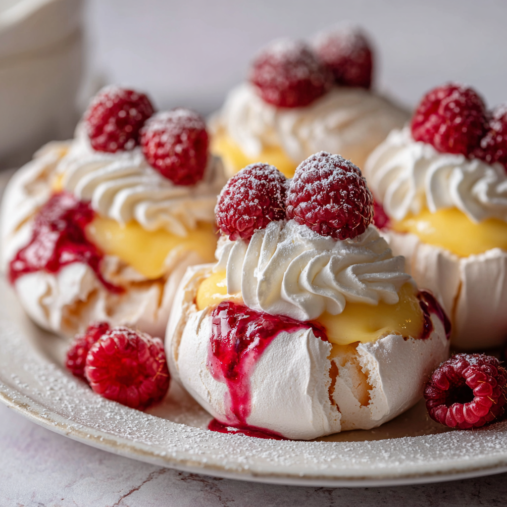 Light and airy mini pavlovas filled with tangy lemon curd and vibrant raspberry coulis, topped with whipped cream and fresh berries.
