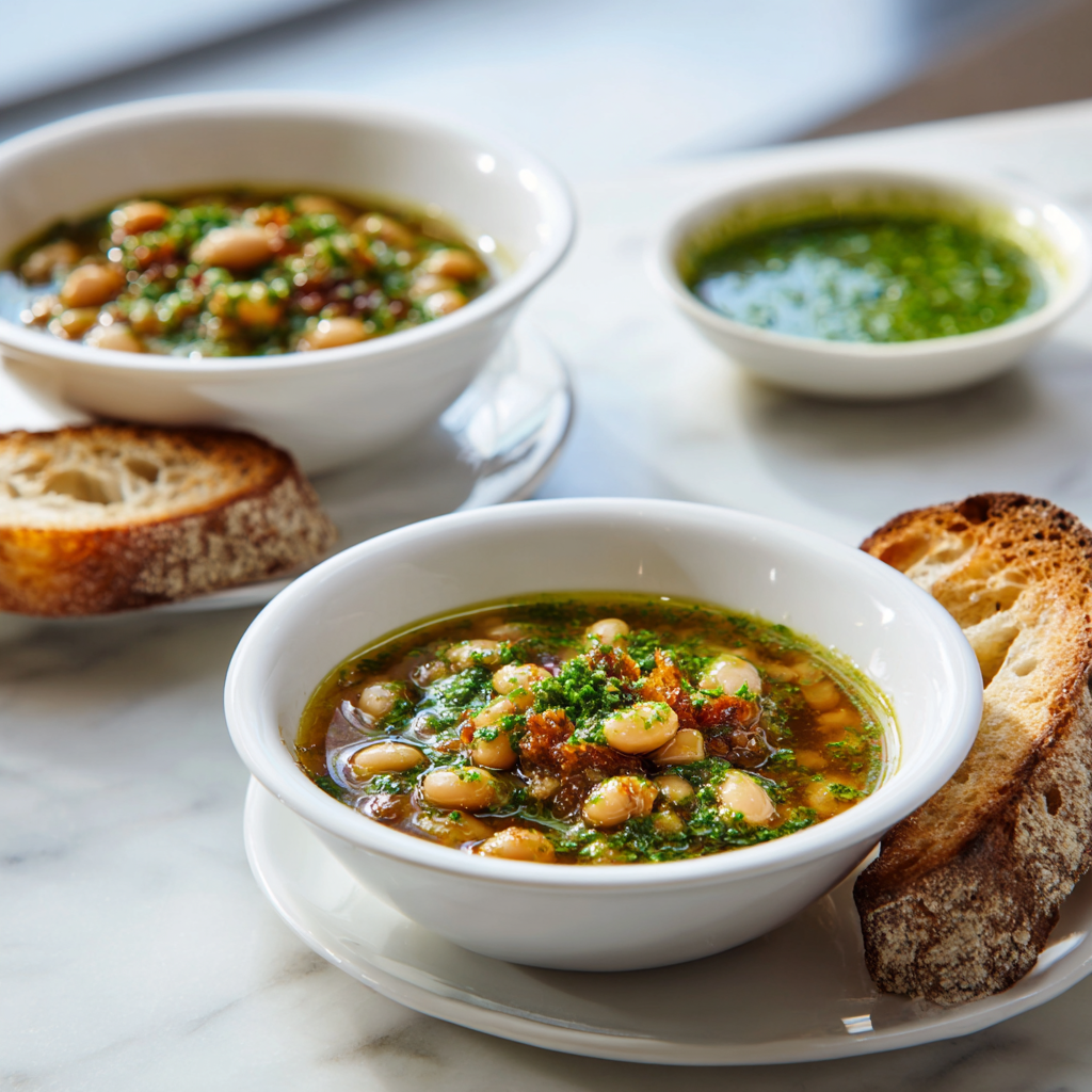 This humble yet elegant dish showcases Mediterranean ingredients at their finest. Creamy white beans simmer gently in a delicate broth, then finished with picada, a traditional Catalan condiment made from garlic, parsley, nuts, and olive oil. The result is a soup that feels both rustic and refined.