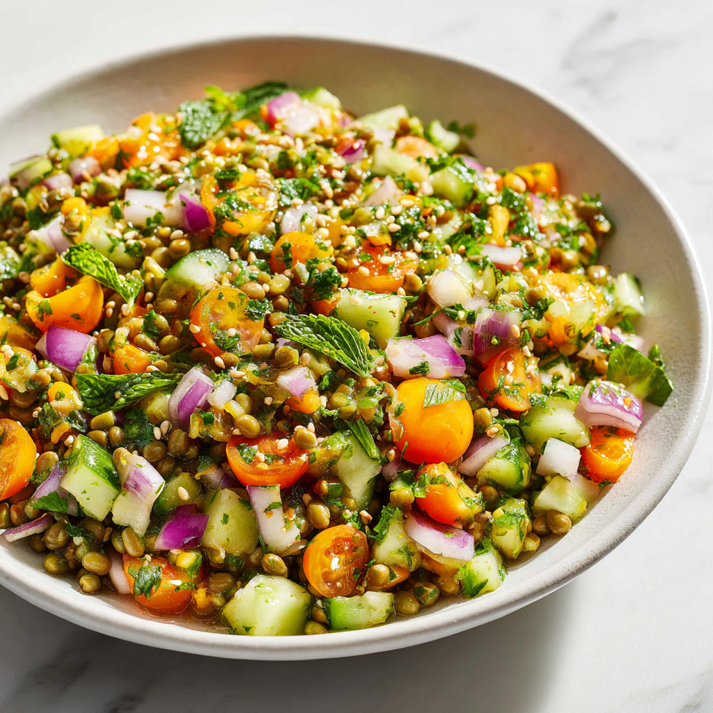 A crisp and refreshing salad made with protein-rich sprouted mung beans, fresh vegetables, and a bright lemon dressing.
