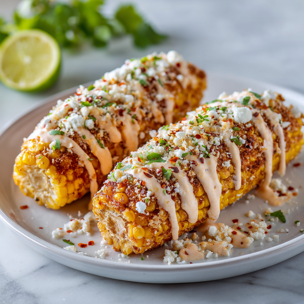 A bold and creamy grilled corn dish coated in spicy mayo and topped with cheese, inspired by Mexican street food.