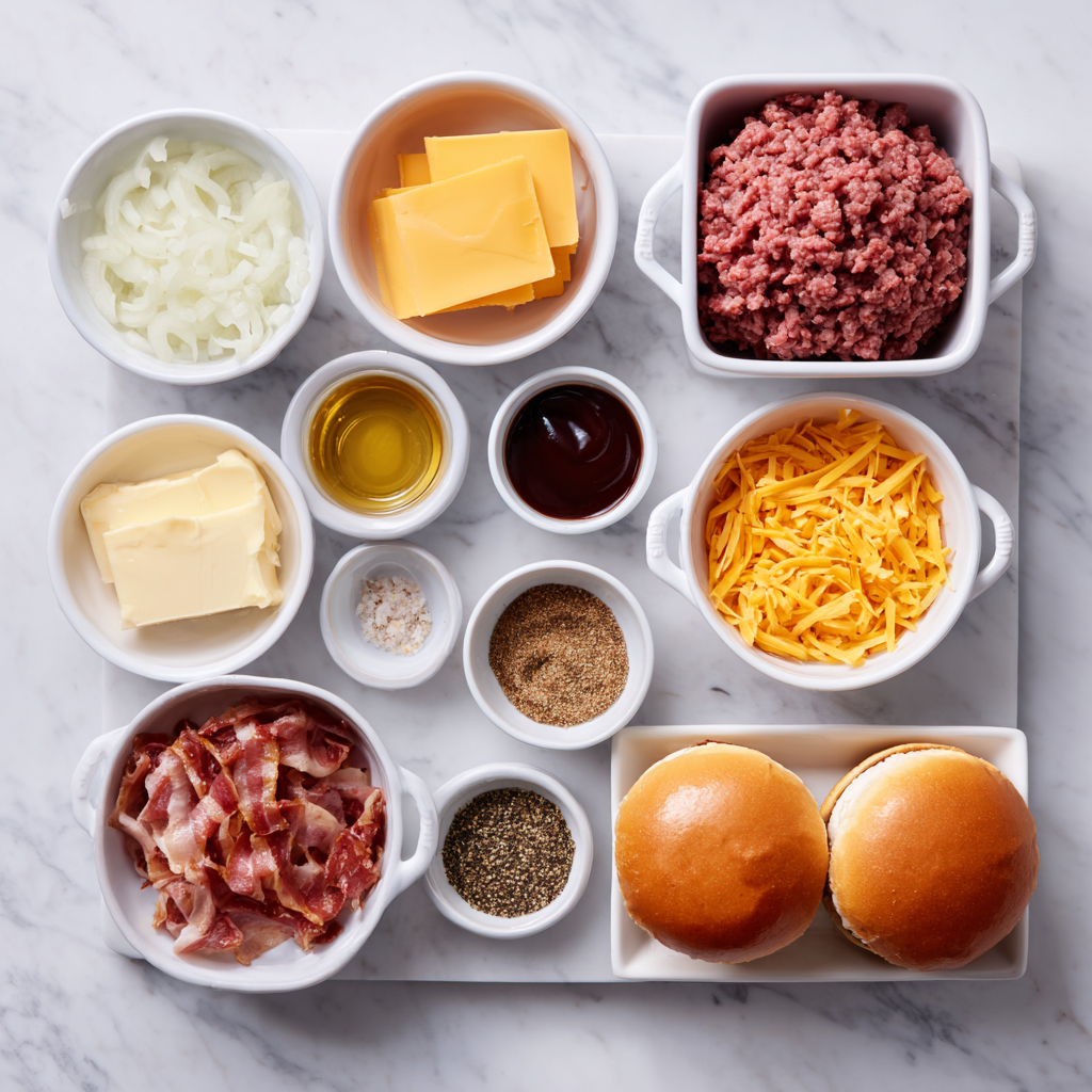 - Layer bottom buns, beef, bacon, cheese, and top buns.