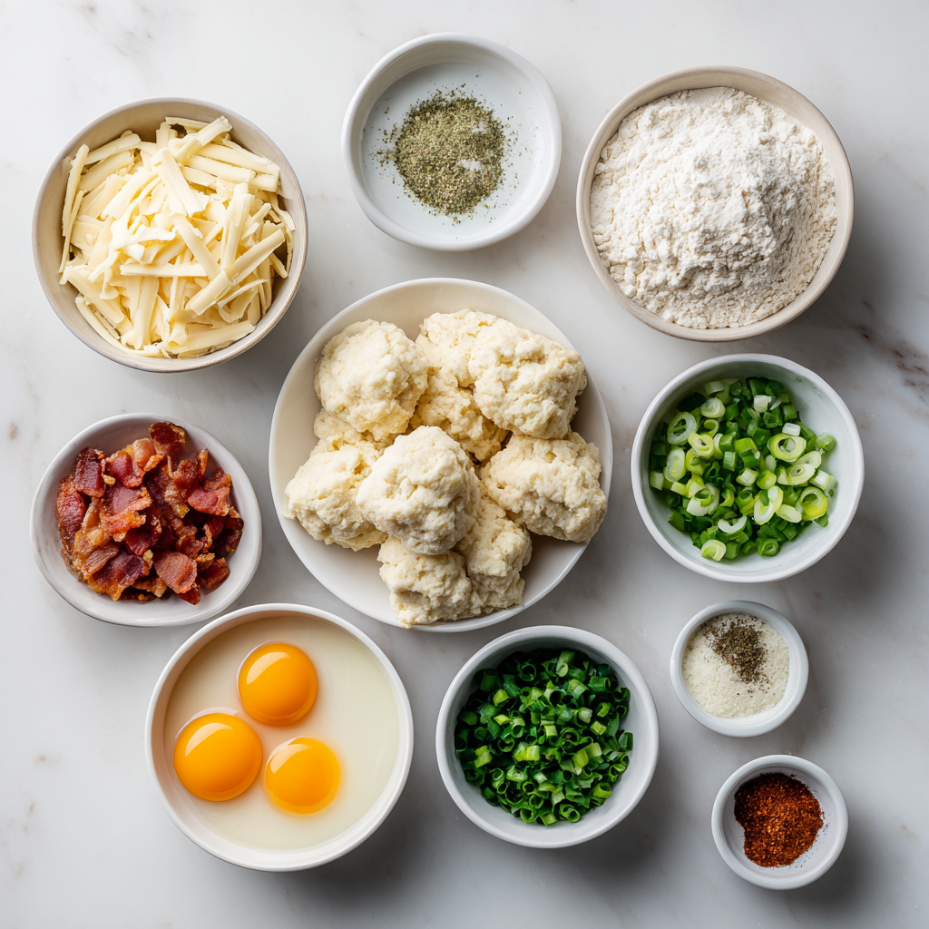 - Add shredded cheddar cheese, crumbled bacon, green onions, garlic powder, onion powder, salt, black pepper, and parsley.