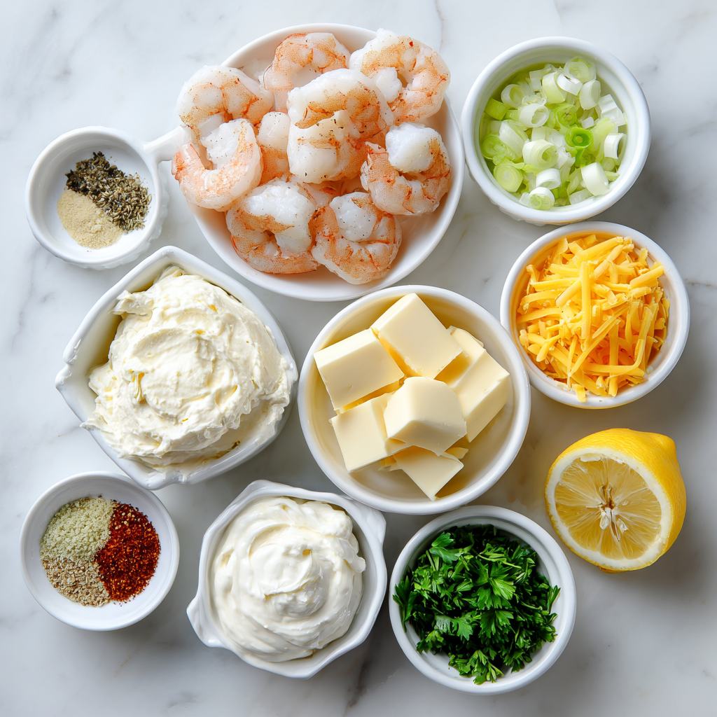 - Stir in cheddar cheese, mozzarella cheese, chopped shrimp, green onions, garlic, lemon juice, parsley, paprika, onion powder, salt, and black pepper.